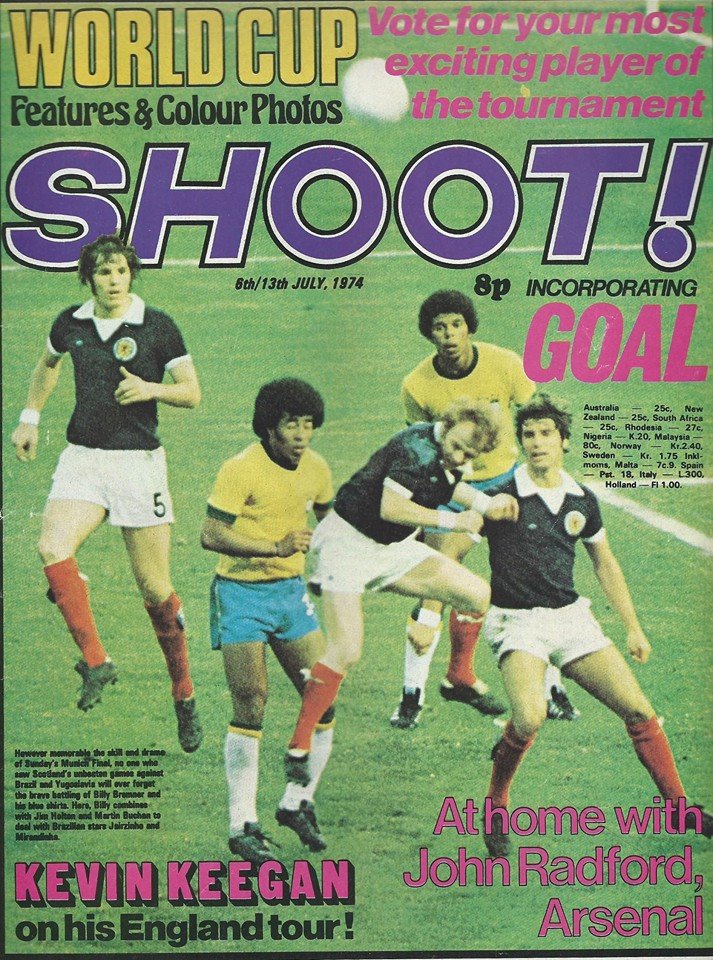 It’s another classic magazine cover and this time it’s from the 1974 World Cup from Scotland v Brazil in Frankfurt, Germany on 18th June 1974. In action is Billy Bremner with Jim Holton and Martin Buchan also in shot. The Brazilians are Jairzinho and Mirandhina. As we all know and as taught in History lessons at school (well it should be) the game ended nil nil. The game is remembered for Billy’s heartaching miss in the second half. Looking at the highlights on You Tube there were plenty of chances for both sides but for Scotland it was a missed opportunity as Brazil were there to be beaten. Who knows if Willie Ormond had introduced a sub at some point perhaps Tommy Hutchison or the criminally ignored Jimmy Johnstone, then maybe history would have a different tale to tell.