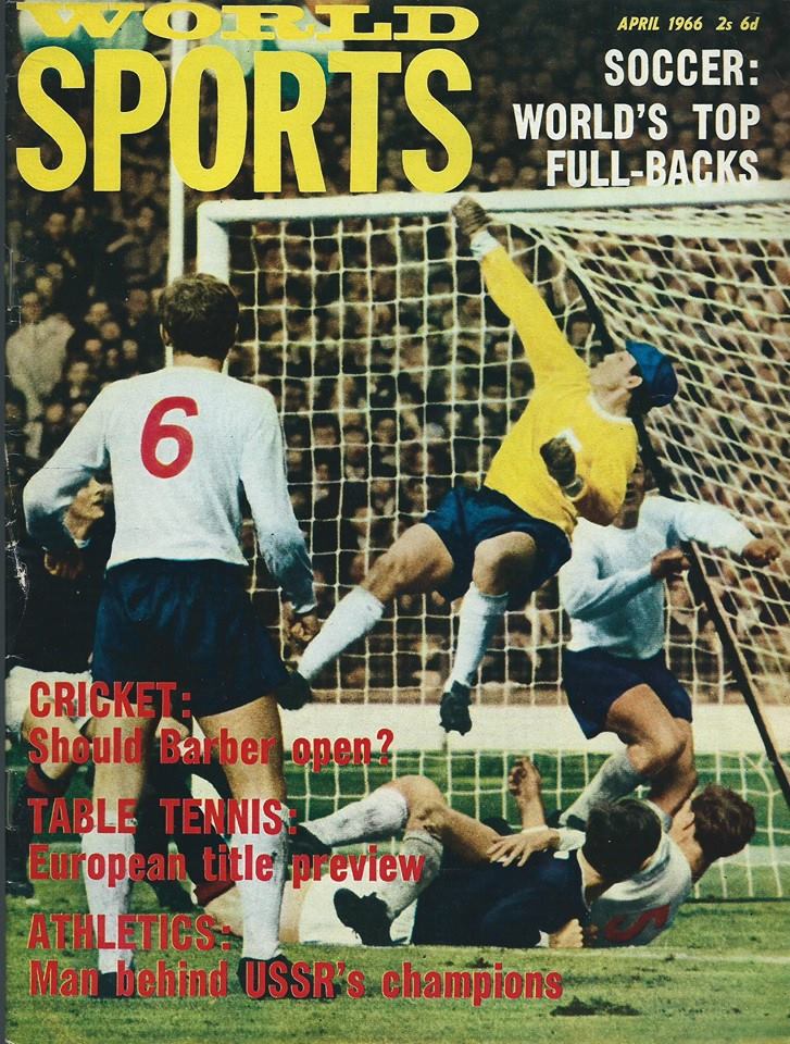 From World Sports Magazine April 1966, this is action from the previous years Auld Enemy match at Wembley. The match ended up 2 all but I have no idea who the two Scots in this photo are. The Scotland line up for the match was Bill Brown, Alec Hamilton, Eddie McCreadie, Pat Crerand, Billy McNeill, John Greig, Willie Henderson, Bobby Collins, Ian St. John, Denis Law and Davie Wilson. I know it’s Gordon Banks in goals and apparently George Cohen behind him with Booby Moore looking on and Jack Charlton holding somebody down. Scotland goalscorers that day were St. John and Denis Law.