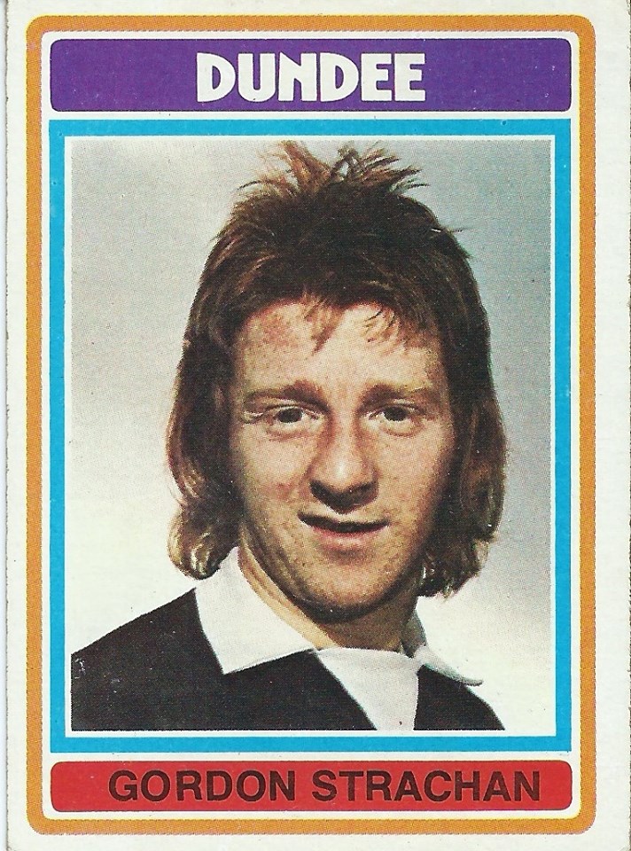 Gordon Strachan was 58 on February 9th 2015, so all at the Scotland Epistles would like to wish him all the best. What better way to celebrate this than a card, although in this case not a Birthday one. The card below is what the Americans would call his ‘rookie’ card, Gordon’s first appearance in football cards in season 1975/76 or the Topps Scottish pink / grey set as sad bores like me know it as. Gordon has just started his career at Dundee and the card describes his play as “stick-it-about style”. Not sure if it’s bad acne or an attempt at a beard in the photo.