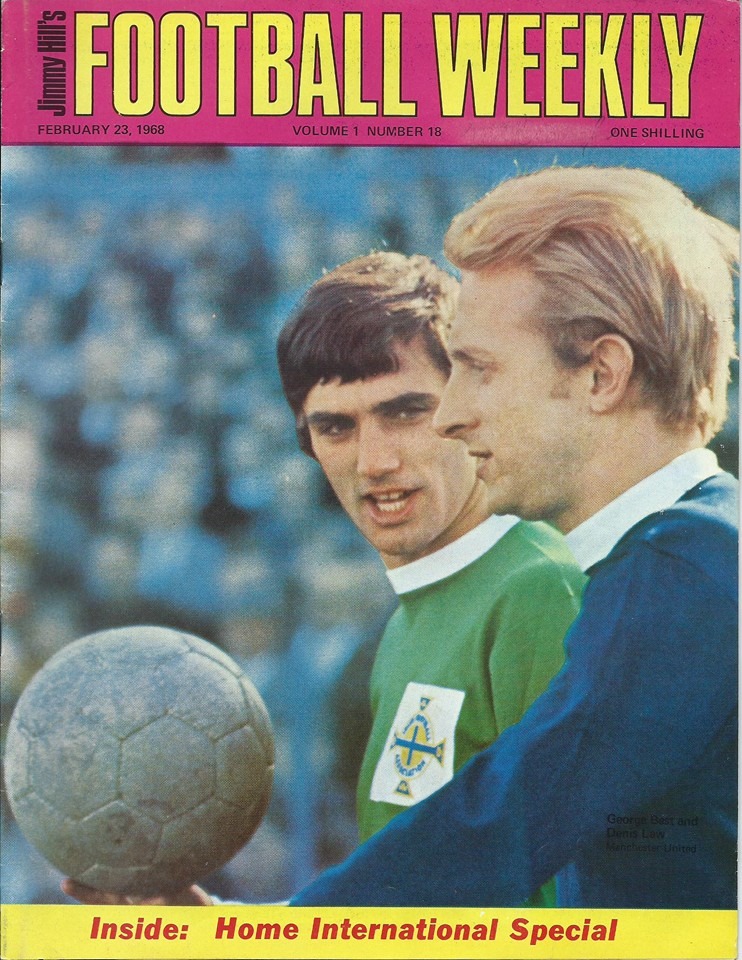 With the Scotland v Northern Ireland game coming up in a few days. I thought I would share this magazine cover. The magazine cover is from Jimmy Hill’s Football Weekly of February 23rd, 1968. I’m not sure if I have seen a football magazine cover so evocative of it’s time and with two of the greatest players these islands have ever produced on it. Two great stars side by side with Denis Law holding on to the ball, possibly prior to start the second half. Of course, George Best is probably saying to Denis ” If you think I ripped yer team to shreds in the first half, wait ’til you see what I’ve got for this one.”