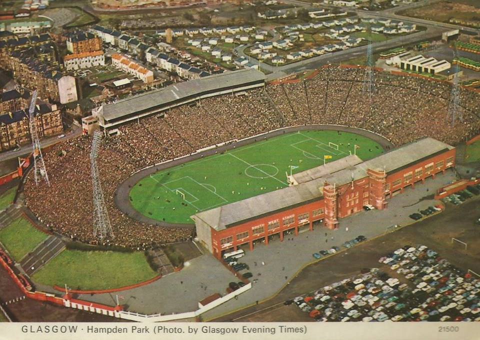 However, it is the photo that we’re concentrating on. I just love the colours in this one. The West stand would shortly have a roof over it but as you can see everyone is packed in like sardines. At the back of the East Stand we can the old bus depot with those Glasgow Corporation Buses, to the left of those are the old prefab homes built just after the war and demolished in the late ’90’s. On the top left hand corner there is some of the terracing of Cathkin Park, home of Third Lanark who would fold in 1967.