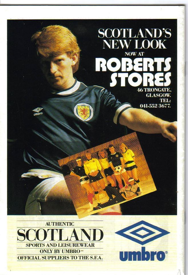 One of the many great things about collecting football programmes is that even the adverts help provide a social history/commentary. Over the years these ‘adverts’ have also included the Scotland replica jerseys some of which have become retro-classics whilst others have moved Gok Wan to tears. Here’s a random selection.Our current manager in his Umbro finery is featured on the back page of the Scotland – England, Rous Cup programme from May 1985. The small insert photo meanwhile includes Alan Rough and Davie Cooper as well as four female models – two of which are wearing the girlie-looking yellow away top. Roughie’s yellow goalie jersey passes the ‘macho-test’ however although the socks look a bit suspect.