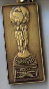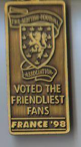 I’ve no idea what the gong looks like that messrs Zidane, Desailly, Deschamps and co picked up at France 98 but here’s an image of my winners medal from that World Cup. OK so it’s actually a souvenir key-ring fob that was given out to perhaps five or ten thousand of us, but hey it was a big squad we had back then.The squad was of course the Tartan Army, and the ‘medal’ was for being voted the friendliest fans of the tournament.
