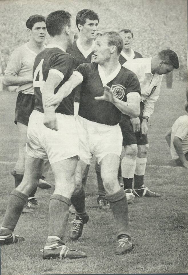 These pictures are from a game against Uruguay at Hampden in May 1962 and it looks as though Pat is trying to get at the injured player. Looking on in the first picture are Jim Baxter and Eric Caldow. The brave man in the second photo, holding back Pat this time is Davie Wilson.