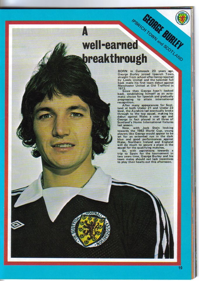 Through gritted teeth then, it’s George Burley’s 59th birthday on 3rd June. George won eleven caps for Scotland between 1979 and 1982 and was a non-playing member of the Spain 82 World Cup Finals squad. The attached image of George the player is from the programme for the 1980 Scotland-England match which the visitors won 2-0. The Ipswich Town ‘Tractor Boy’ got his eighth cap that day when he replaced St. Mirren’s Iain Munro after 62 minutes.On a more positive note Hurly-Burley also played in Euro-qualifiers where we skelped Norway 4-0 in Oslo and Portugal 4-1 at Hampden.