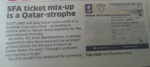 On Saturday I received my tickets for the Scotland -Qatar match on 5th June and I was intrigued to note that they are headed – albeit in very small print -‘Qatar Airways Cup’. So that story about the semi-final ticket mix up was close to the truth after all. We’re through to the final and there is a trophy up for grabs. I hope the prize is like one of those monster-sized golf trophies that is almost the same height as our manager.