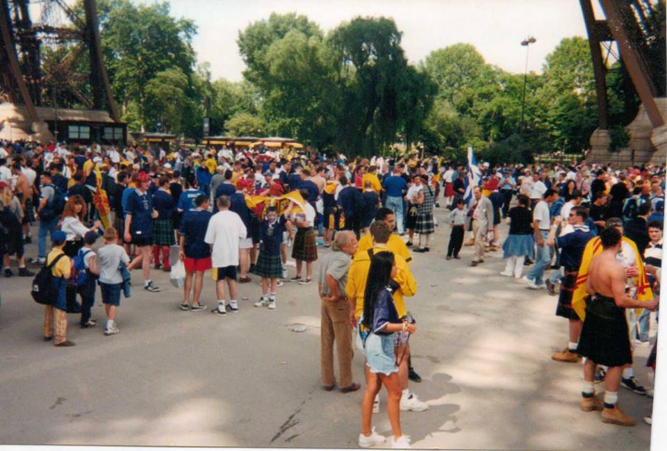 I had watched the game on the big screen at the Hote de Ville (town hall) in Paris with my 11 year old son Jordan, my brother David and several friends, and two of my outstanding memories of that day were the sound of John Collins’ penalty and the soakin wetness of the final whistle. When Collins slotted the penalty home to equalise, there was an incredible sound, apart from the huge cheer, I’d never heard before or since; it was the sound of thousands of beer, whisky and wine bottles and glasses, bein dropped on the ground or accidentally thrown in the air as the majority of the crowd leapt up in a great outpourin of joy and threw their arms wide ready to hug each other in celebration, before comin crashin and smashin back down to earth. It was an incredible, indescribable sound, like an elongated crrrrsssshhhmasshhhh (telt ye – indescribable). Oh how we cheered and danced (makn sure not to fall on the broken glass) and sang and hugged and gret
