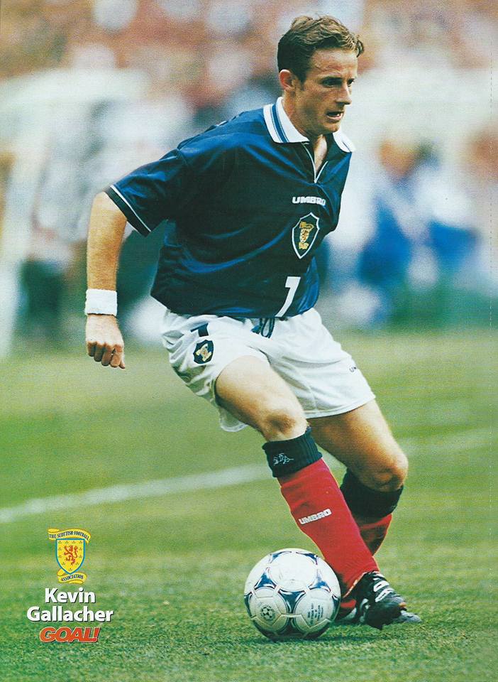 Two games left and both at home; Belarus at Pittodrie and Latvia at Celtic Park. In the first, Gallacher settles Scotland nerves when a save from a well worked free kick by Collins and McAllister sees him with a tap in to put the Scots in front after only five minutes. He would score a second and Scotland’s third with David Hopkin also scoring two to see us win 4-1. Against Latvia and again it’s his positioning that allows Kevin to head a goal in on 24 minutes after a great shot from Collins is parried out by the Latvian goalkeeper. With ten minutes remaining Gallacher attempts an audacious chip which rebounds off the bar for Gordon Durie to head in and it’s France here we come.