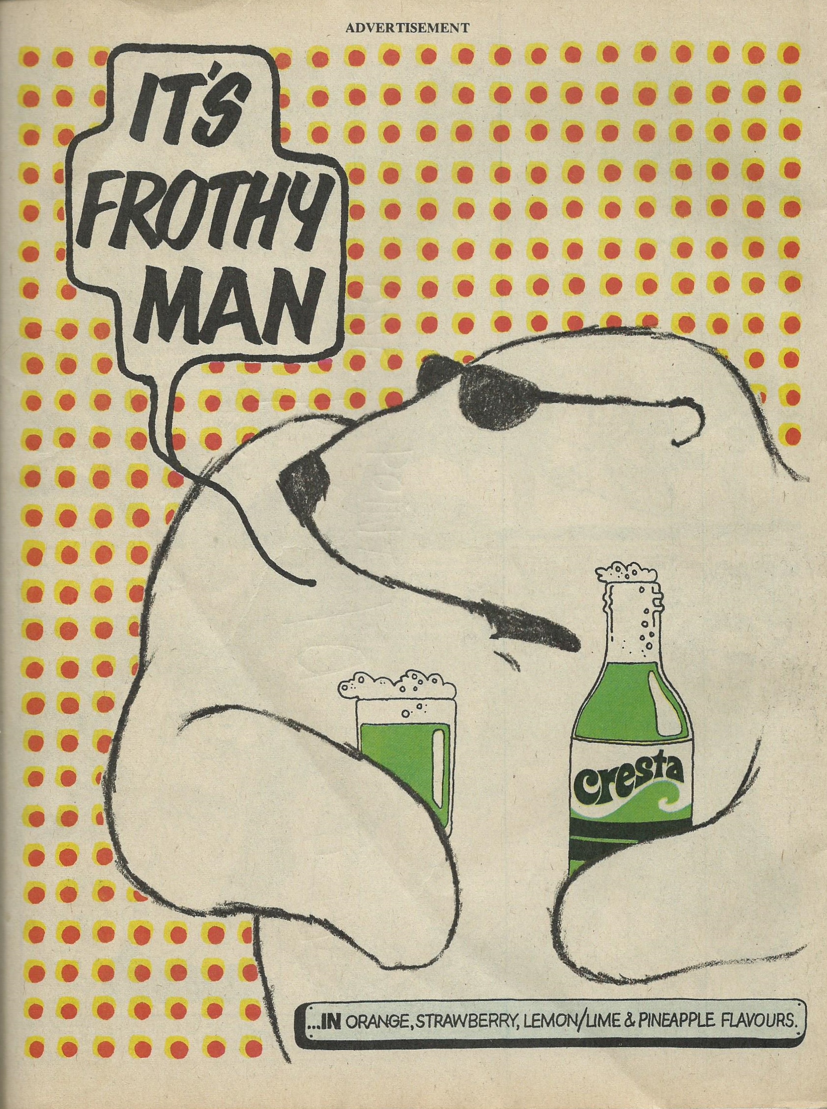 Of the adverts there’s one for Cresta juice. It’s frothy man!