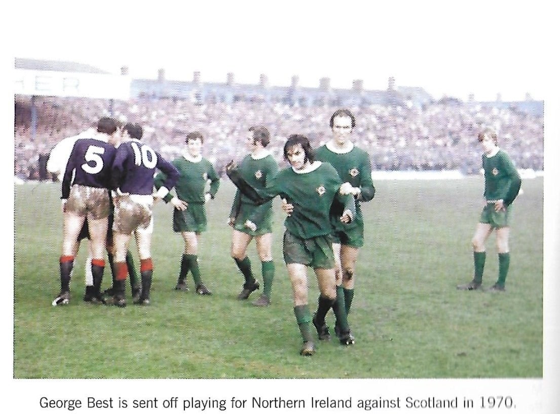 Photo from the book ‘Football Stories Bad Boys and Hard Men’ by Niall Edworthy comes George Best being sent off v Scotland at Windsor Park, on April 18th, 1970 with Derek Dougan escorting him off the park. McKinnon & Gilzean are the Scots surrounding the ref.