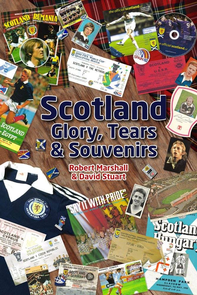 Scotland – Glory, Tears & Souvenirs is an offbeat collection of memories, mementos, rants and aspirations relating to Scotland’s national football team. A ‘look back in hunger’ on the post-war era, with emphasis on the 1970s to date. A reminder of the way football was, the way it is now and the way we’d like it to be! There’s Switzerland 54, Denis Law, trading cards, match programmes, Archie Gemmill, Argentina 78, beermats, Kenny Dalglish, vinyl records, Spain 82, Ally McCoist, the Tartan Army, Italia 90, the Kirin Cup, Jimmy Hill, France 98, Panini stickers and James McFadden. Nostalgia and a warped sense of humour are what gets Scotland supporters through in a nightmare world where all our near-neighbours now get to ‘go to the ball’ – France 2016, at least – while we await the arrival of a Fairy Godmother and a defence that doesn’t leak goals. There’s no room for wallowing in self-pity, though. Read this therapeutic comfort blanket of a book, cheer at the good bits and laugh at the bad. We shall overcome…