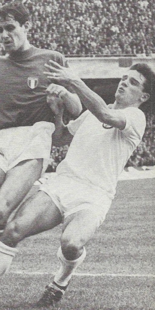 Also making his debut v Northern Ireland in April 1970 was John O’Hare of Derby County. Seen here in his 2nd match v Wales a few days later. John won 13 caps & scored 5 goals including the winner on his debut.