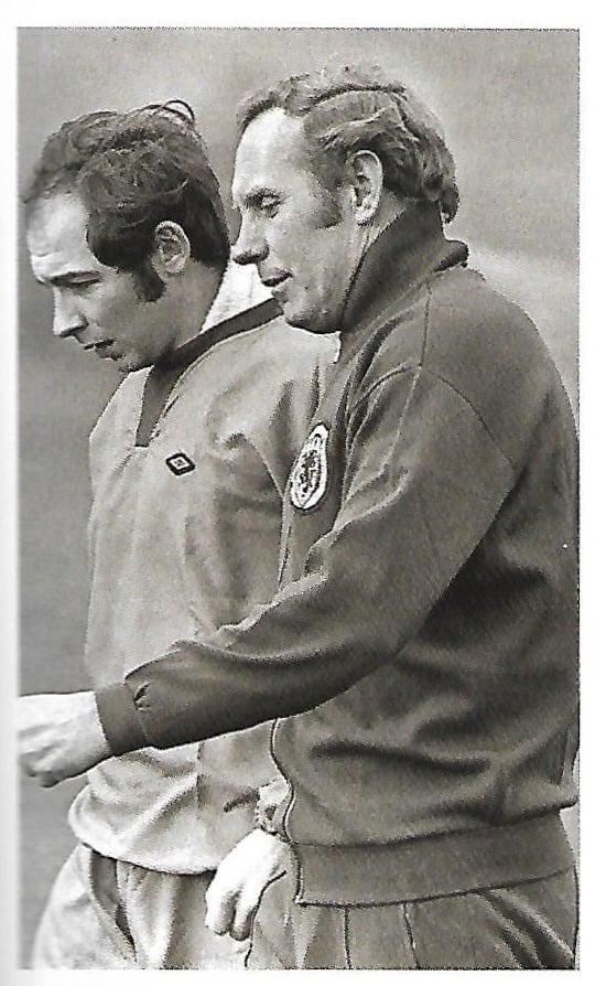 Player #30. April 21st 1971 and Drew Jarvie of Airdrie makes his debut appearance for Scotland in a 2-0 loss to Portugal. Drew won three caps for Scotland. Seen here with manager Bobby Brown.